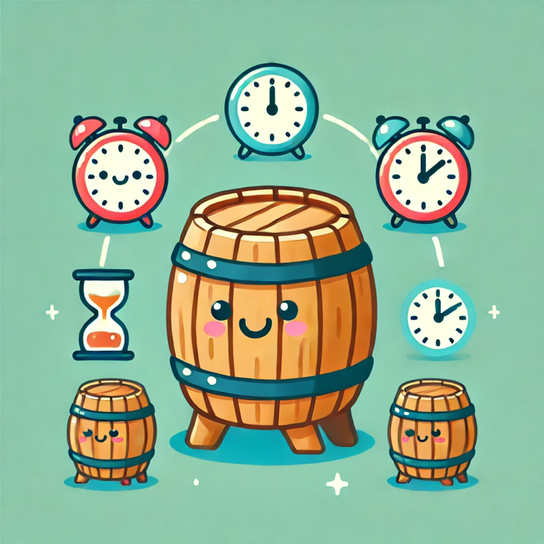 숙성 기간 동안 술이 보관되는 숙성 통(배럴)의 종류는 술의 맛에 큰 영향을 미친다. 일반적으로 위스키, 브랜디, 럼 같은 술들은 오크통 에서 숙성되며, 이는 술의 맛과 향을 복잡하고 깊이 있게 만들어 준다. 오크통은 나무 자체가 술과 상호작용을 하면서 타닌 , 리그닌 , 바닐린 같은 다양한 화합물을 술에 녹여 넣는다.