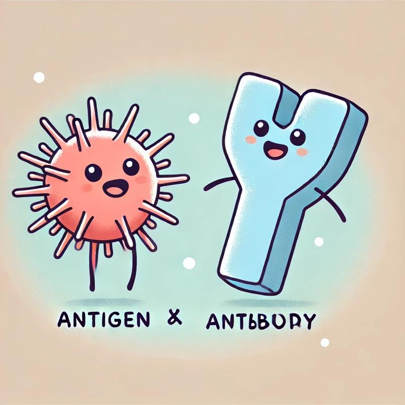 항체(Antibody)는 항원에 대처하기 위해 면역 체계에서 만들어지는 특수 단백질입니다. 항체는 B세포라는 면역 세포에서 생성되며, 면역 글로불린(Ig)이라는 단백질로 이루어져 있습니다. 항원이 몸에 들어오면, B세포가 이를 인지하고 항원에 특이적으로 결합하는 항체를 만들어 냅니다.