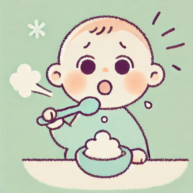- 젖을 먹다가 고형식(이유식)으로 바꾸는 과정에서 씹고 삼키는 동작을 제대로 익히지 못하면 사레가 자주 들릴 수 있습니다.