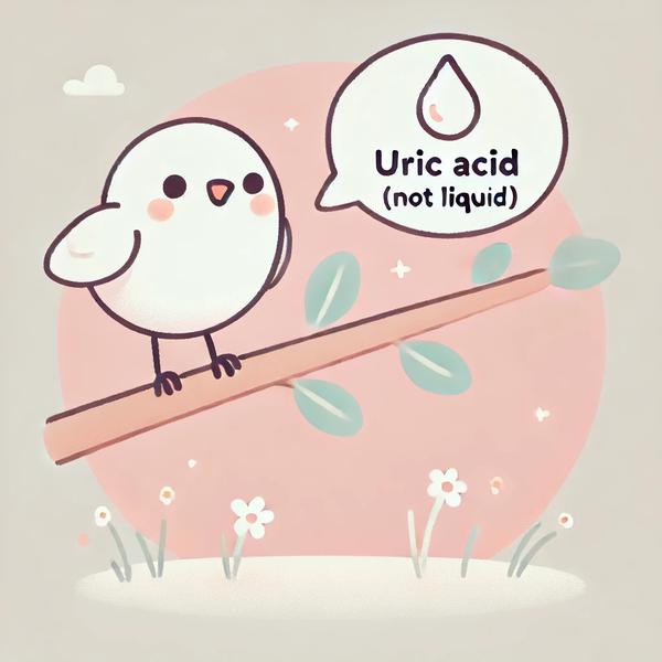 새는 포유류처럼 액체 형태의 소변을 배출하지 않습니다. 대신, 질소 노폐물을 '요산'이라는 형태로 배출하는데 , 이 요산은 물에 잘 녹지 않아 흰색 크림 같은 반고체 상태 로 나오게 됩니다. 우리가 자동차나 바닥에 떨어진 새똥을 보면, 가운데 갈색은 대변이고 그 위나 주위의 하얀 부분이 바로 이 요산입니다.