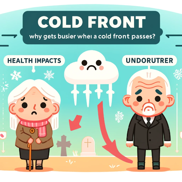 이러한 이유들로 인해 한랭전선이 지나가면 장의사들이 바빠질 수밖에 없습니다. 뇌출혈이나 심장 발작 등은 치료하지 않으면 사망에 이를 수 있는 급성 질환입니다. 따라서, 한랭전선이 지나가는 시기에는 이러한 급성 질환으로 인한 사망자가 증가할 수 있습니다.