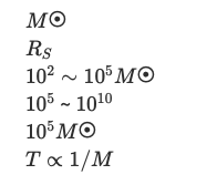 | 질량 범위 (M☉) | 약 3 ~ 100 | 약 100 ~ 100,000 | $10^5$ ~ $10^{10}$ 이상 | 매우 다양 (원자 질량 이하 ~ $10^5 M☉$) |