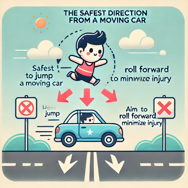 따라서, 더 안전한 방법은 자동차가 진행하는 방향과 반대 방향으로 뛰어내리는 것입니다. 이렇게 하면 자동차가 달리는 속도와 몸이 나아가려는 속도가 서로 상쇄되어 몸이 땅에 떨어질 때 가해지는 충격을 줄일 수 있습니다.
